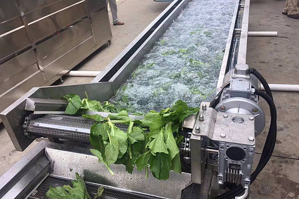 第二步、果蔬经网带传送至有喷淋管的二次清洗区进行二次清洗, 在输送过程中经过清水的喷淋二次清洗区将产品再清洗一次冲洗一遍达到干净的目的,一方面给槽内补充水量,另一方面也能由好的冲洗完果蔬达到的漂洗之功能。除去表面农药残留,同时可加入适量的药剂进行消毒固色。漂浮物可从溢流槽溢出,沉淀物从下面排水孔排出,以达到消毒,清洗的目的。