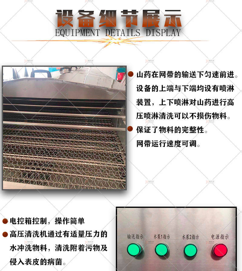 新型山药专用清洗机,又可称为滚杠式高压喷淋清洗机,主要用于山药、莲藕等表面泥土清洗作业,该机清洗效果好,能有效清洗物料标表面的泥土,不损伤表皮,且可以实现连续式作业,提高生产效率.